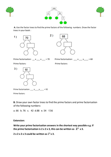 Printable worksheets on finding factors, factor trees, prime numbers, greatest common factors, and factor trees.