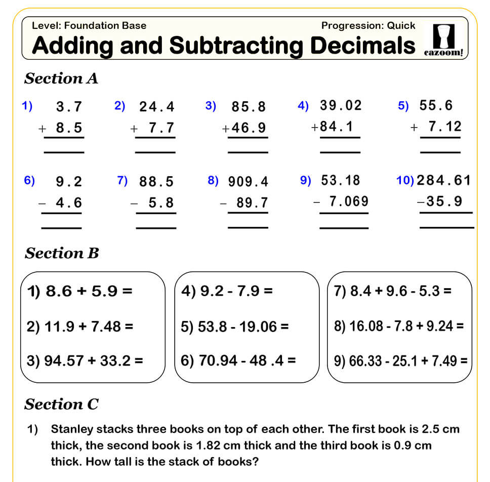 Free Adding And Subtracting Decimals Worksheets. The decimal subtraction worksheets feature exercises in formats like columns or rows and tools like explore the decimal subtraction worksheets in detail. This decimals worksheet will produce addition and subtraction problems.
