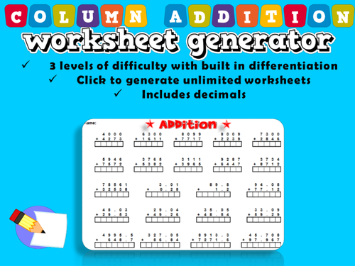 Generate Addition Worksheets. You can generate printable addition worksheets (one page of questions and one page of answers) with 8, 10 or 12 problems. Our new number bonds worksheet generator will allow you to create your own printable number bonds worksheets.
