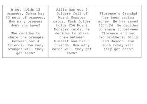 Explain to students that, like the story problem you just read aloud, many math questions involve having to perform multiple math steps in order to find the final answer. She used a sixth of them in some cakes and scrambled one quarter of them for tea. 118,214 pairs of boots were sold, 37,092 more pairs of sandals than pairs of boots were sold, and 124. Multiplication and division word problems.
